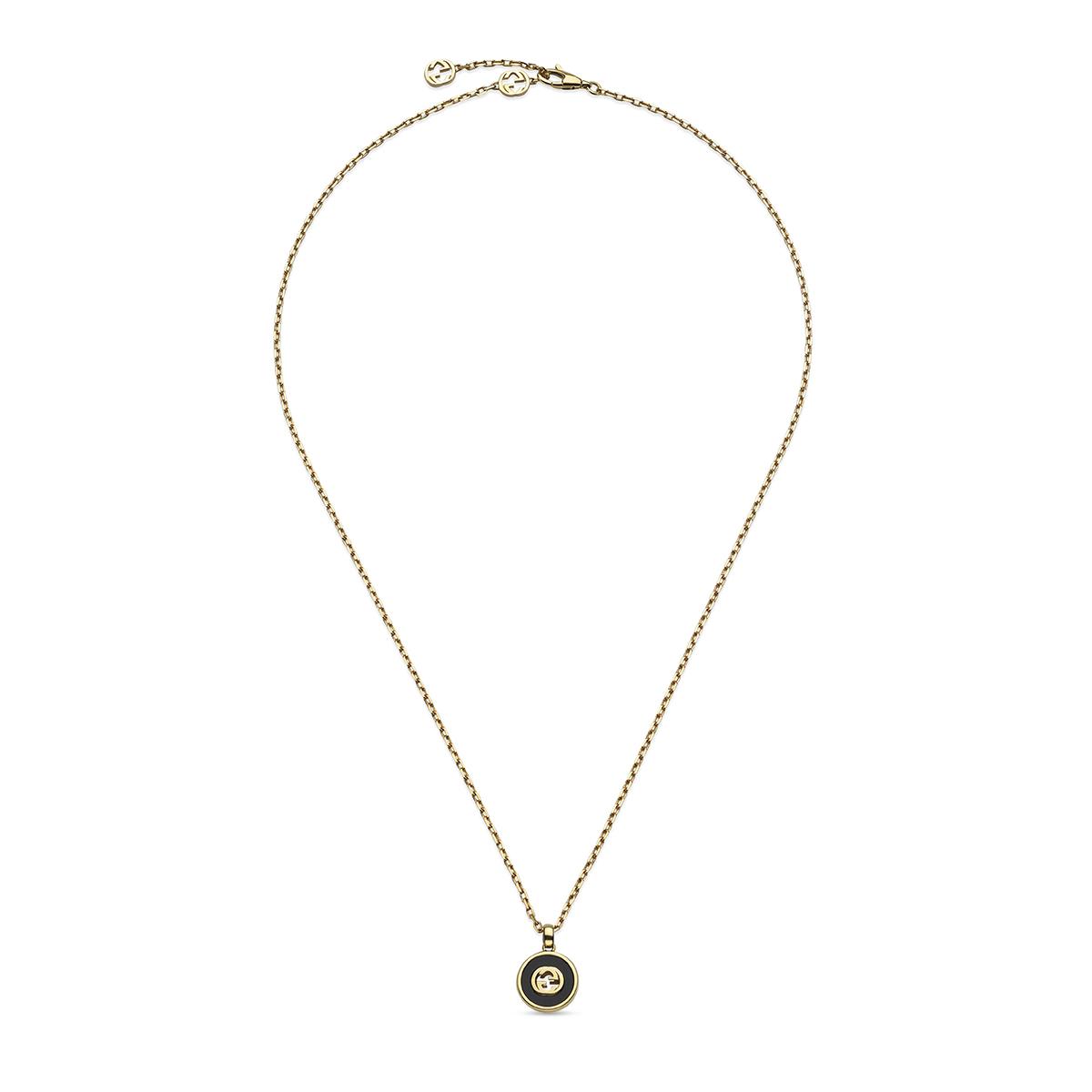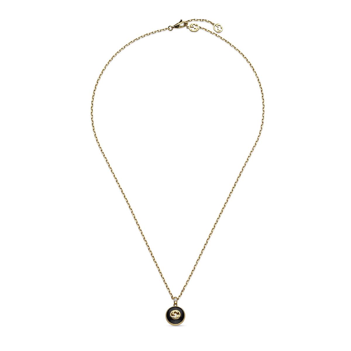 Złoty naszyjnik z kolekcji Gucci spodoba się miłośniczkom klasyki w nowoczesnym ujęciu. Łańcuszek o splocie ankier zdobi okrągła zawieszka z onyksem. Ażurowy detal z logo marki w centrum nadaje biżuterii oryginalny ton, maleńki brylant umieszczony nad onyksem dodaje całości blasku.
