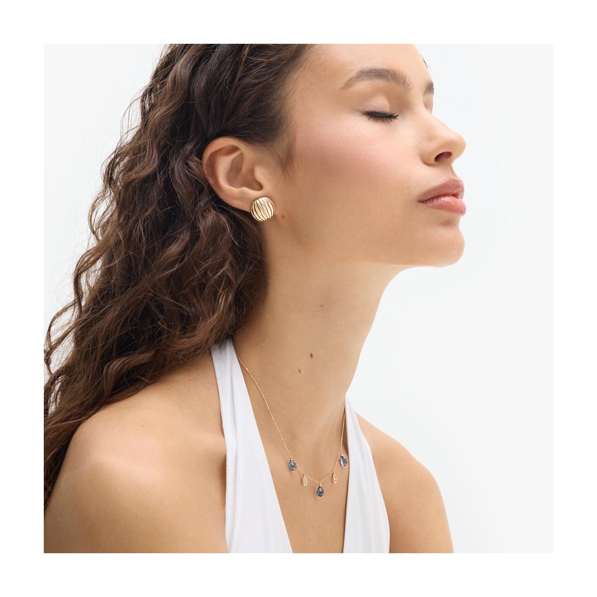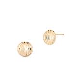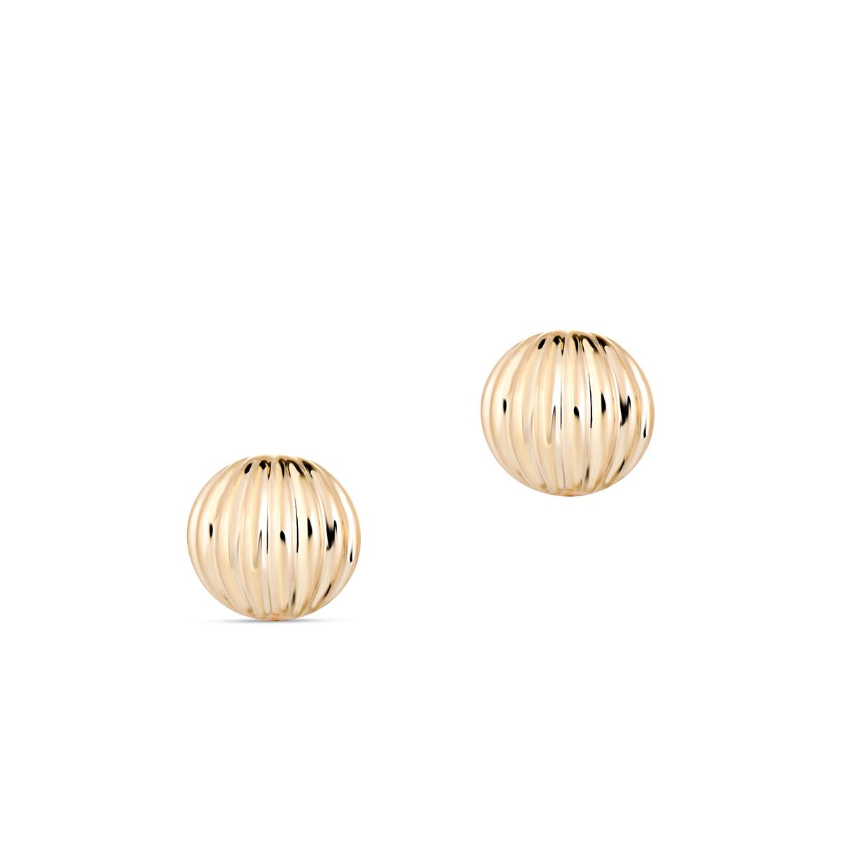 Złote, okrągłe kolczyki o wypukłej formie to nowoczesna interpretacja klasyki. Zapinane na sztyft, zapewniają komfort i elegancję każdego dnia. Ich powierzchnię zdobi wyrazisty, wytłaczany wzór z pionowymi liniami, które podkreślają przestrzenność formy i efektownie załamują światło. Dzięki temu biżuteria zyskuje dynamiczny charakter, pełen blasku. Efektowne kolczyki idealnie wpisują się w codzienne stylizacje z nutą wyrafinowania.