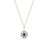 Zestaw złotej biżuterii z niebieskimi cyrkoniami łączy w sobie kunszt wykonania i finezyjny design. Kompozycja niebieskich cyrkonii w subtelnej oprawie z żółtego złota nawiązuje do nurtu retro, co nadaje jej oryginalny charakter. Błękit kamieni przepięknie wyróżnia się na tle ciepłej barwy złota.