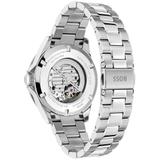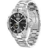 Zegarek męski Hugo Boss z kolekcji Troper cechuje się kopertą wykonaną ze stali szlachetnej, o szerokości 42 mm. Stalowa bransoleta została zakończona zapięciem zatrzaskowym. Czarna tarcza odznacza się wycięciem w cyferblacie (open heart), a chroni ją szkło mineralne – odporne na stłuczenia. Wodoszczelność do 10 bar pozwala na pływanie na basenie. Czasomierz wyposażony jest w mechanizm automatyczny.