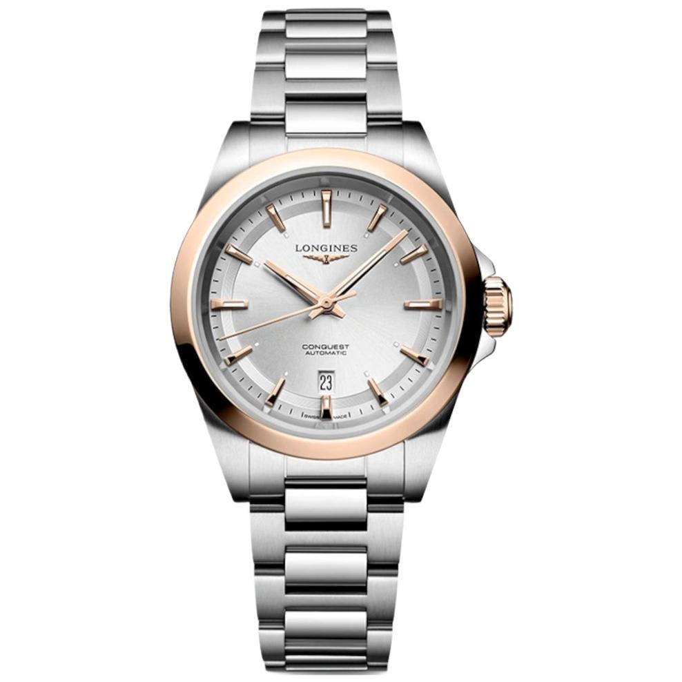 Zegarki z kolekcji Longines Conquest charakteryzują się solidnymi stalowymi kopertami, które często mają wykończenie polerowane lub matowe. Posiadają sportowy, ale jednocześnie elegancki wygląd, co sprawia, że nadają się zarówno do noszenia na co dzień, jak i w bardziej formalnych sytuacjach. Kolekcja ta to seria eleganckich i funkcjonalnych zegarków sportowych, która łączy w sobie prestiż marki Longines z wytrzymałością i nowoczesnym designem.Zegarek damski Longines Conquest posiada kopertę o szerokości 30 mm, wykonaną ze stali szlachetnej i 18-karatowego różowego złota. Bransoleta zakończona jest wygodnym zapięciem motylkowym. Srebrna tarcza odznacza się wyjątkową czytelnością. Czasomierz posiada mechanizm automatyczny L592 z datownikiem i 45-godzinną rezerwą chodu. Wodoszczelność do 10 bar pozwala na pływanie w zegarku.